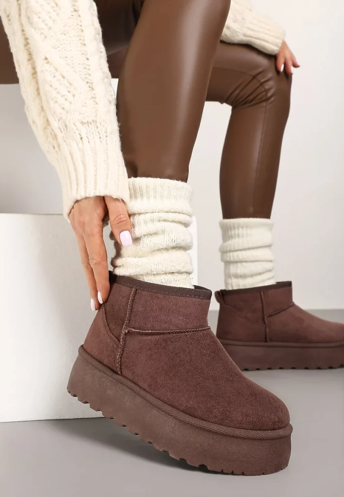 Chcesz optycznie wydłużyć nogi? Dobierz spodnie lub grube rajstopy w tym samym kolorze co buty – to działa jak total look dla dolnej części sylwetki. A jeśli masz krótsze nogi – super sprawdzą się śniegowce na platformie albo z bardzo lekkim obcasem.