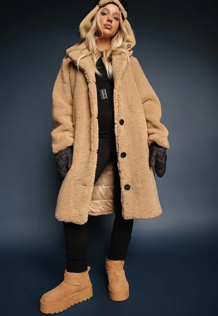 - Teddy coat + śniegowce – puchata faktura płaszcza w połączeniu z miękką cholewką butów daje superprzytulny efekt.