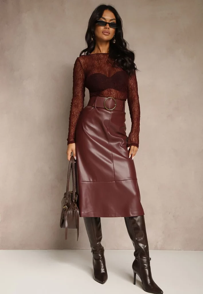 - 3. Bordowa Spódnica o Trapezowym Kroju z Imitacji Skóry z Szerokim Paskiem Saliavesa
