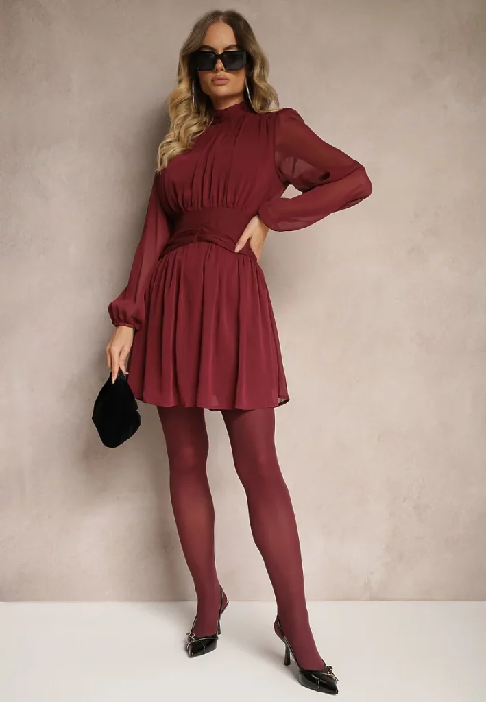 - 5. Bordowa Rozkloszowana Sukienka z Półprzezroczystymi Wstawkami i Stójką Gelabine
