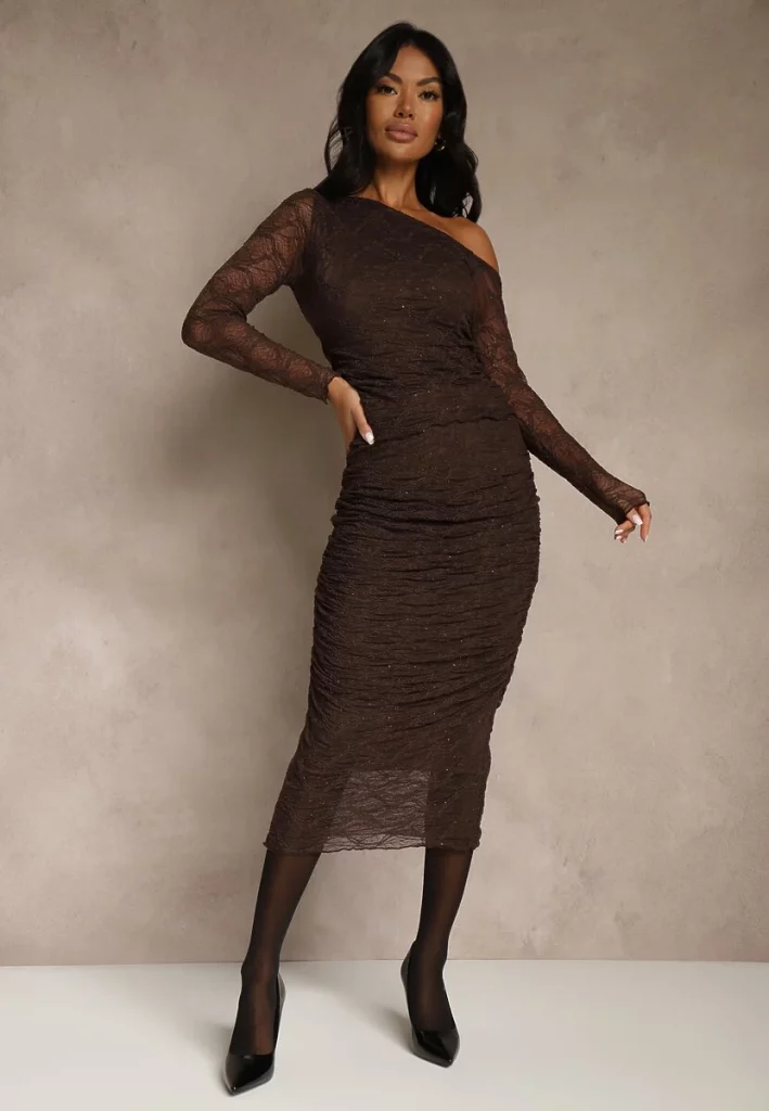 - 2. Brązowy Komplet z Koronki: Ołówkowa Spódnica i Longsleeve Off-Shoulder Nerinaera