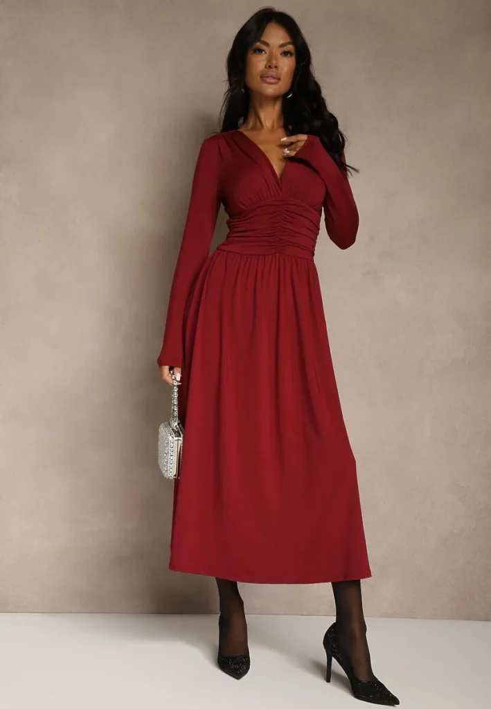 - 1. Bordowa Taliowana Sukienka Longsleeve z Wiskozy z Marszczeniem i Dekoltem V Elirie