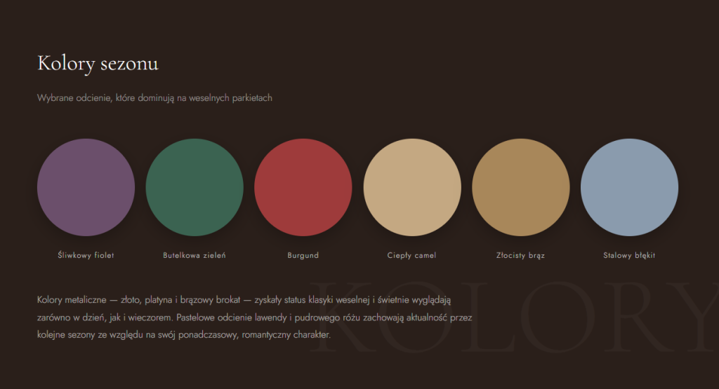 Reguła o unikaniu bieli na weselu pozostaje aktualna, ale poza tym paleta możliwości jest niemal nieograniczona. Odważne odcienie koloru burgundu, głęboka zieleń butelkowa i intensywna szałwia nieustannie zyskują na popularności. Pastelowy liliowy i beże w ciepłej tonacji to z kolei bezpieczna elegancja. Nieoczekiwanym hitem są odcienie metaliczne – złoto, srebrny szampan i brązowy brokat – noszone nie na bankietach sylwestrowych, lecz właśnie na weselach o każdej porze roku.