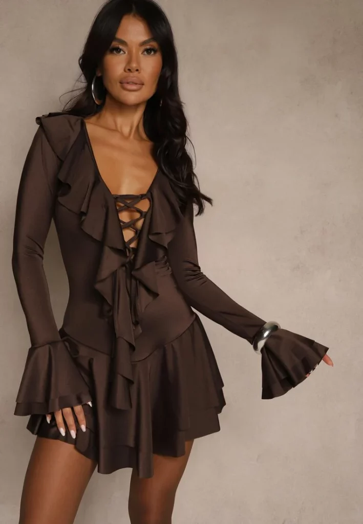 • Satynowa sukienka z długim rękawem w stylu flared – idealna do tańca, bo każdy obrót to historia.