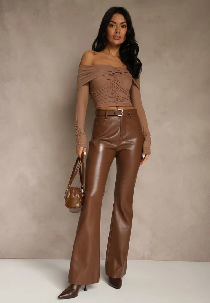 - 1. Ciemnobeżowa drapowana bluzka VICES z odkrytymi ramionami i siateczkowymi rękawami Atevite