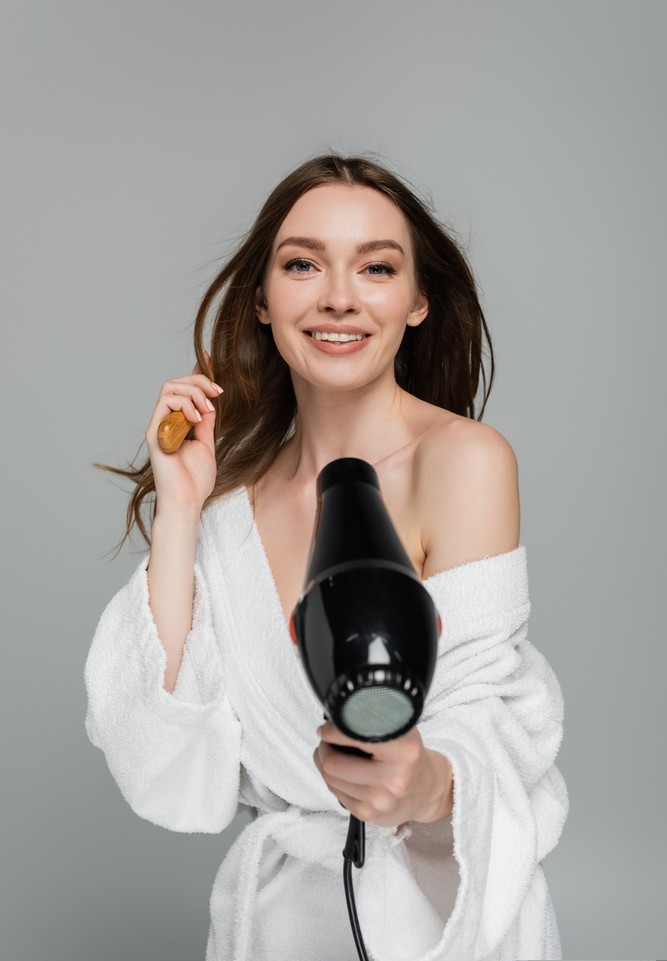 - Gorące powietrze z suszarki skierowane „pod prąd” – gorące powietrze otwiera łuski termicznie (kutikula pęcznieje od ciepła), a dmuchanie od dołu unosi je przeciwnie do ich naturalnego ułożenia. Przegrzanie prowadzi do suchości i zwiększa puch.